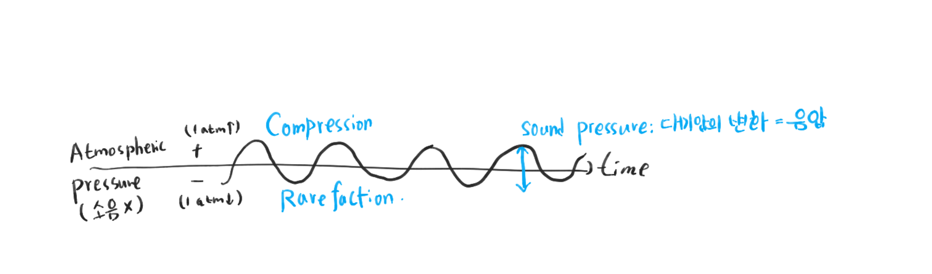어떠한 소음도 없는 정상대기는 1atm. 진동으로 인해 공기가 Compression되어 밀도가 커지거나, rarefaction되어 밀도가 작아질 경우. 시간에 대해 다음과 같은 모양을 나타내게 되고 이들의 폭을 Sound Prssure 음압이라고 한다.