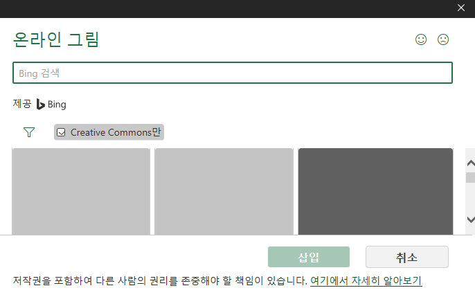 4. 배경버튼을 누르면 아래와 같은 [그림삽입] 창이 나옵니다. 여기서 Bing 이미지 검색을 이용합니다.