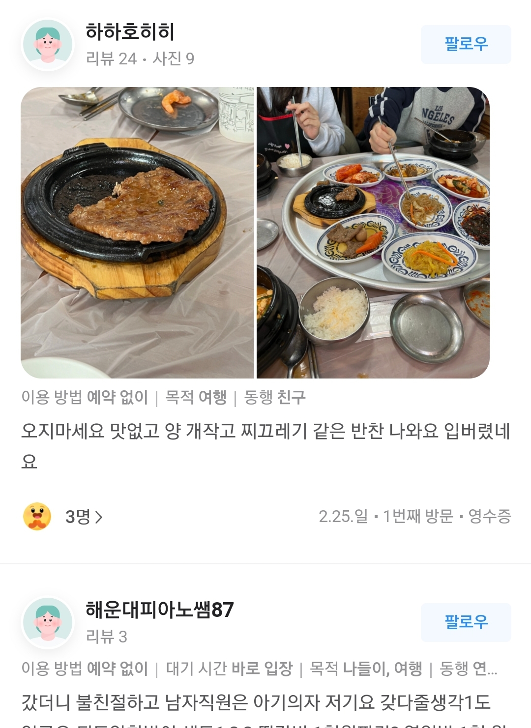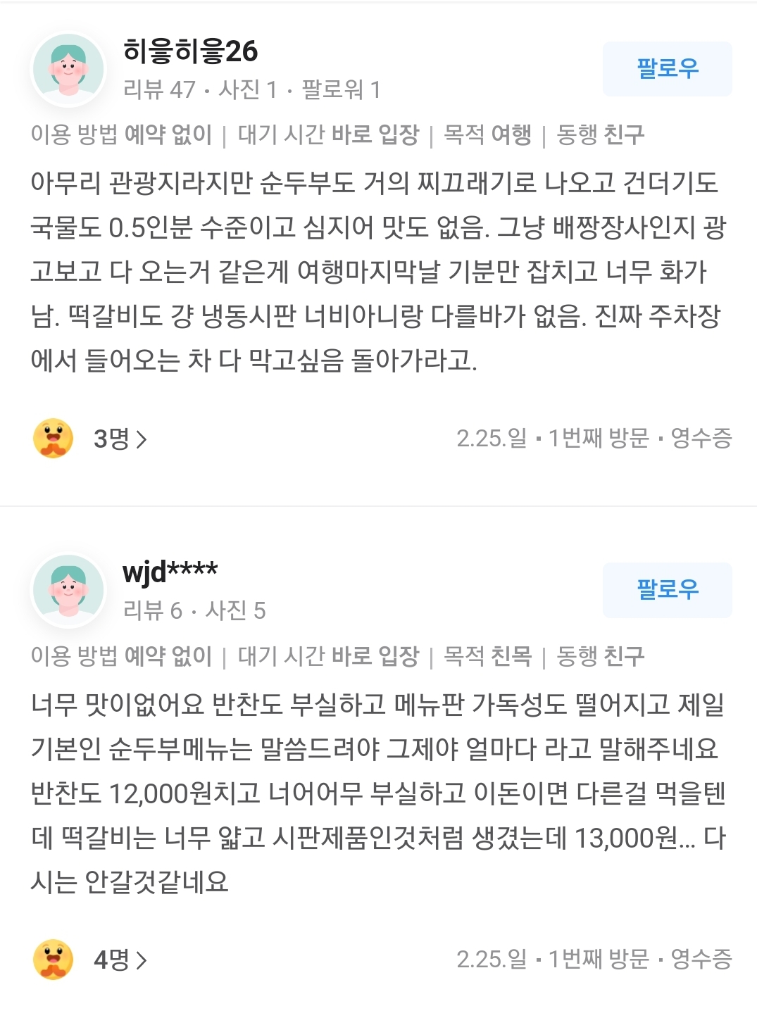 경주 원조떡갈비 리뷰는 광고업체가 작업한게 정황상 분명하다는 생각이 듬. 음식 하나하나 클로즈업해서 사진 우려먹기에, 깡계정으로 극찬 리뷰남기기 일색. 사진을 보면 한끼 식사의 반찬의 배치가 바뀌어 있는게 많다. 블로그 광고에 돈을 굉장히 많이 쓴 것 같다. 반대로 정성껏 적은 리뷰를 보면 아쉬운점이 많다.