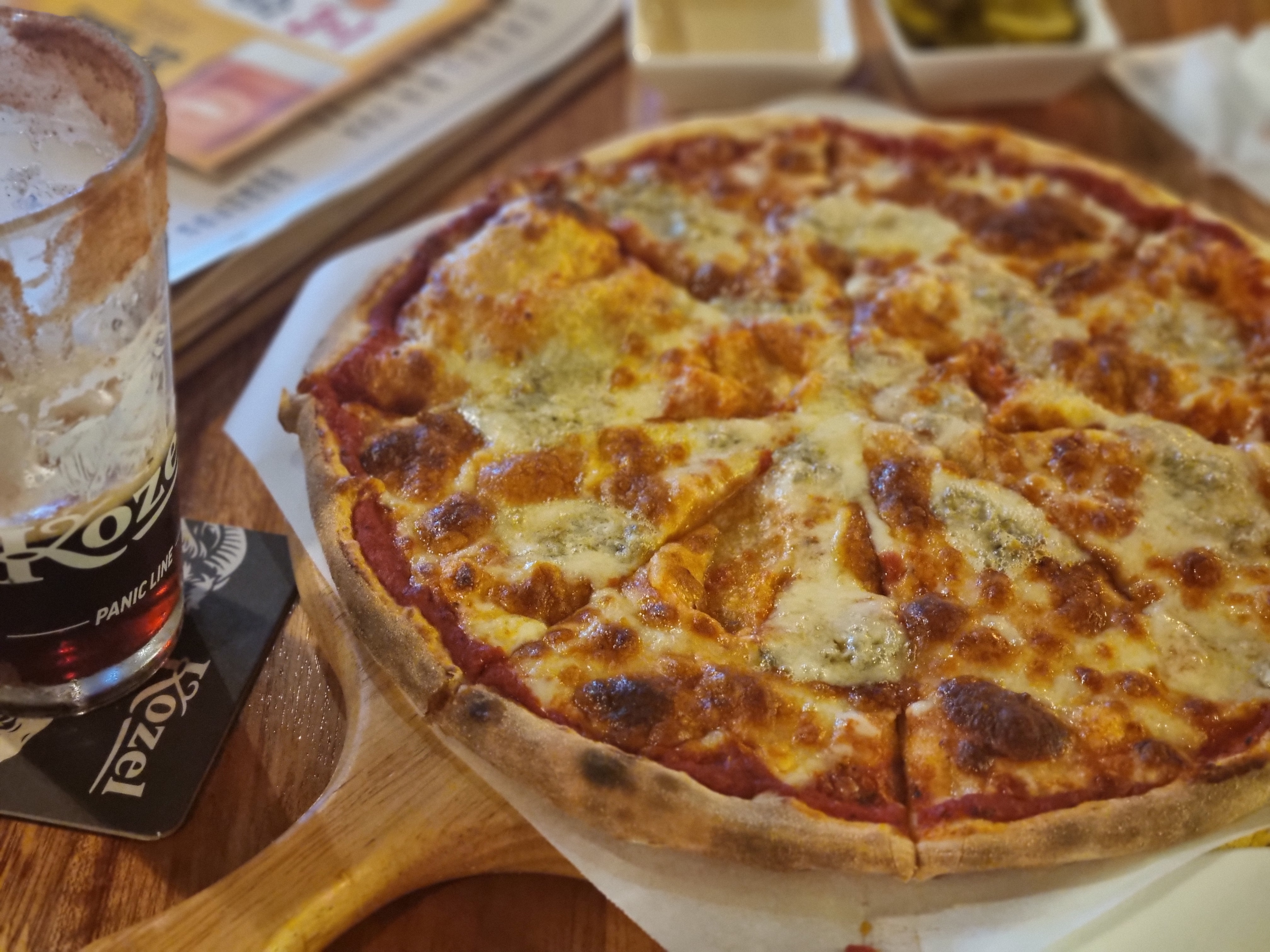 맥주만 마시기 아쉬워서 고르곤졸라 피자를 시켰는데,
