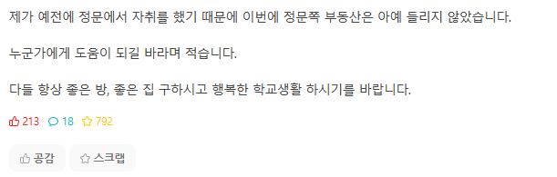 다들 항상 좋은 방, 좋은 집 구하시고 행복한 학교생활 하시기를 바랍니다.