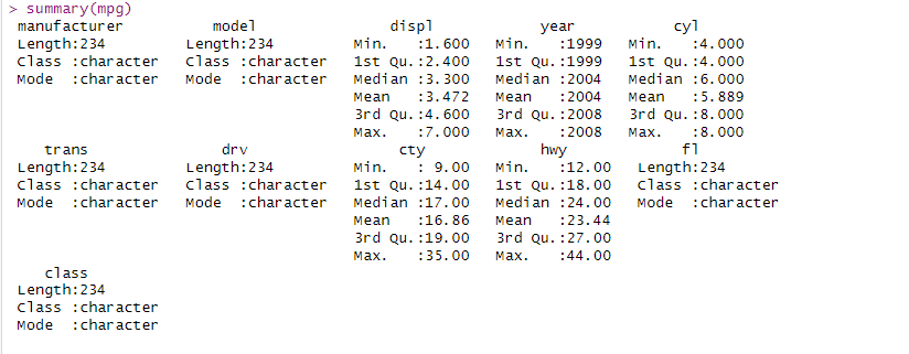 패키지에 들어있는 변수는 ?mpg와 같은 식으로 도움을 받을 수 있다.