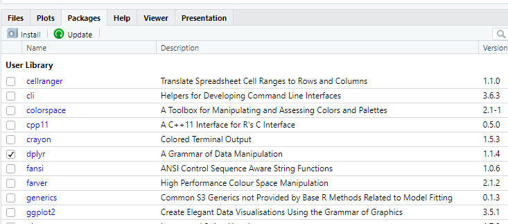 packages 창에서 dplyr에 체크가 되있는 걸 확인한다.