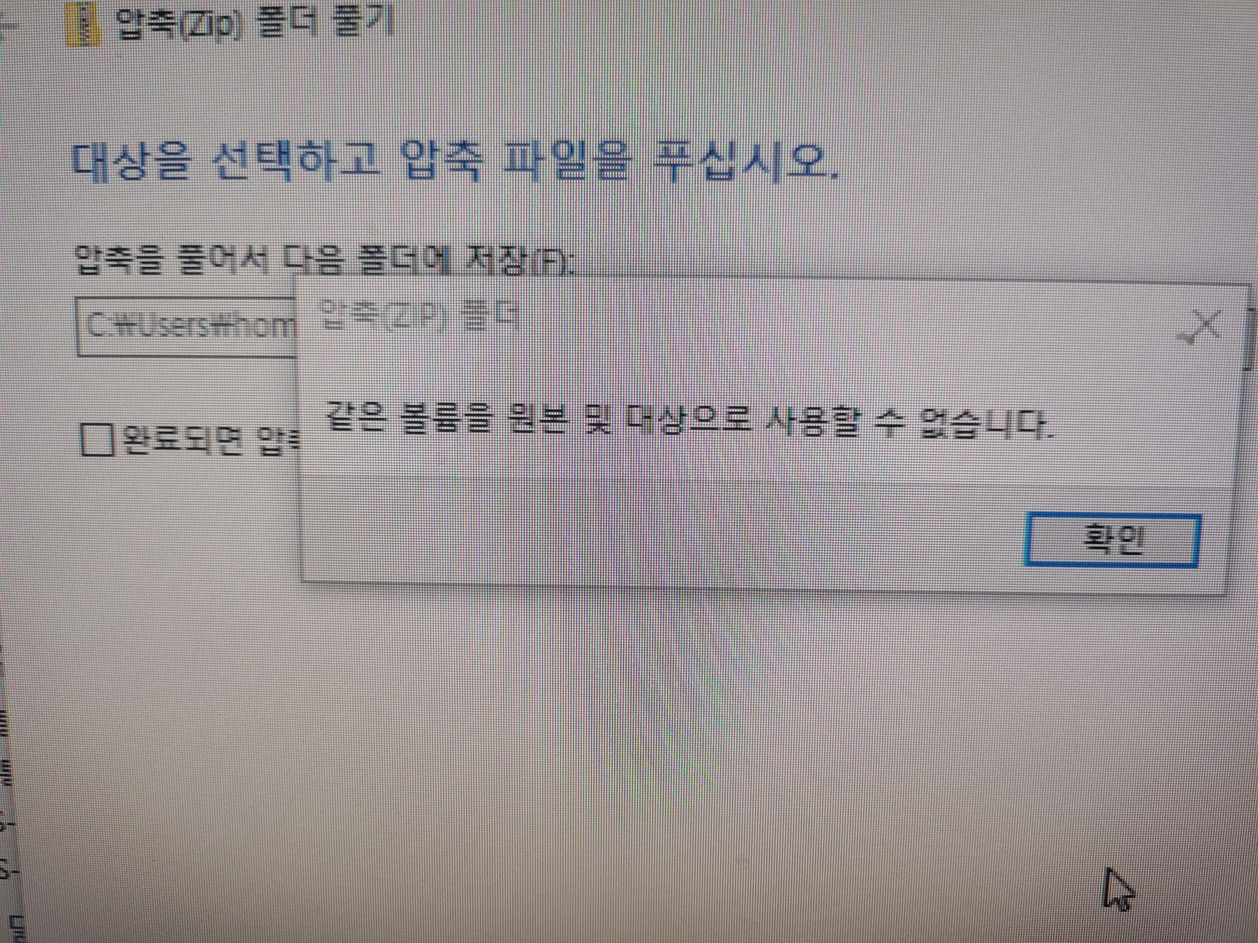 [압축오류] 같은 볼륨을 원본 및 대상으로 사용할 수 없습니다 해결