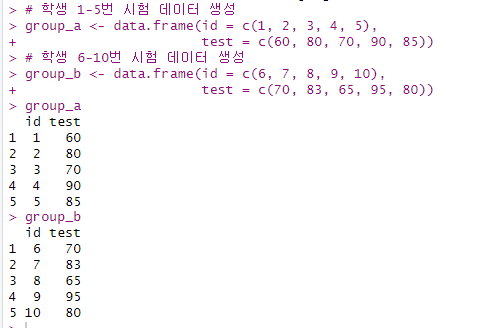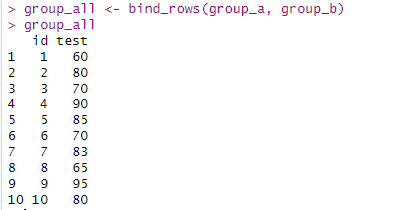 group_a <- data.frame(id = c(1, 2, 3, 4, 5),