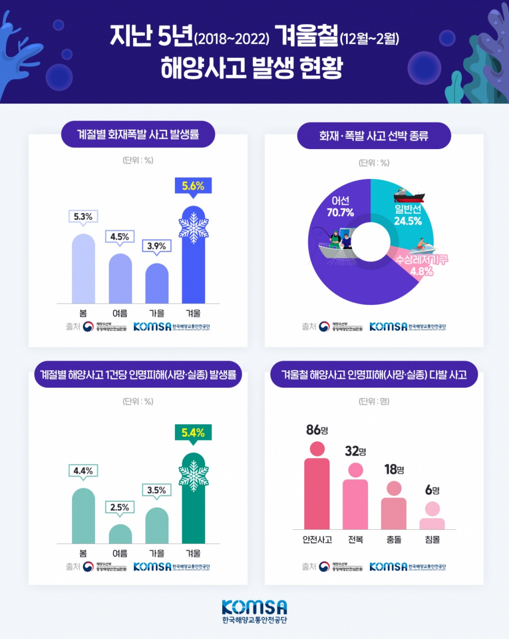 - 겨울철 선박 화재·폭발 사고 발생률이 5.6%로 가장 높습니다[14].