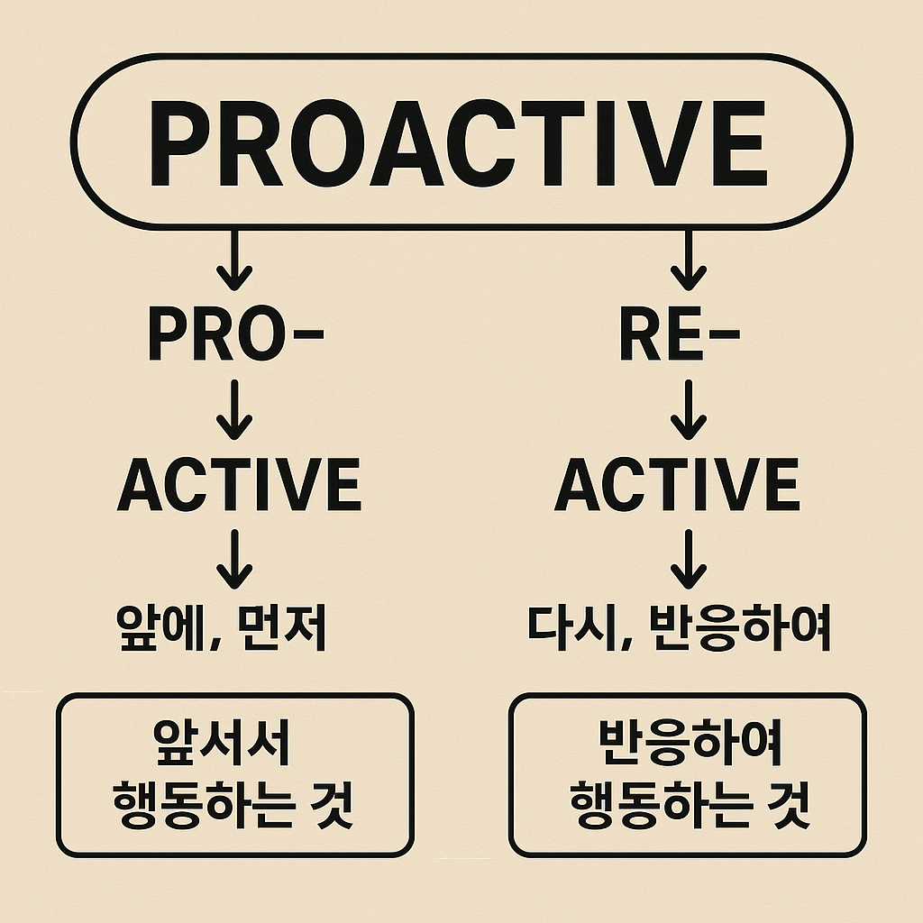 | Proactive | 앞으로, 앞서서 | 일이 일어나기 전에 주도적으로 행동 | 선제적 |
