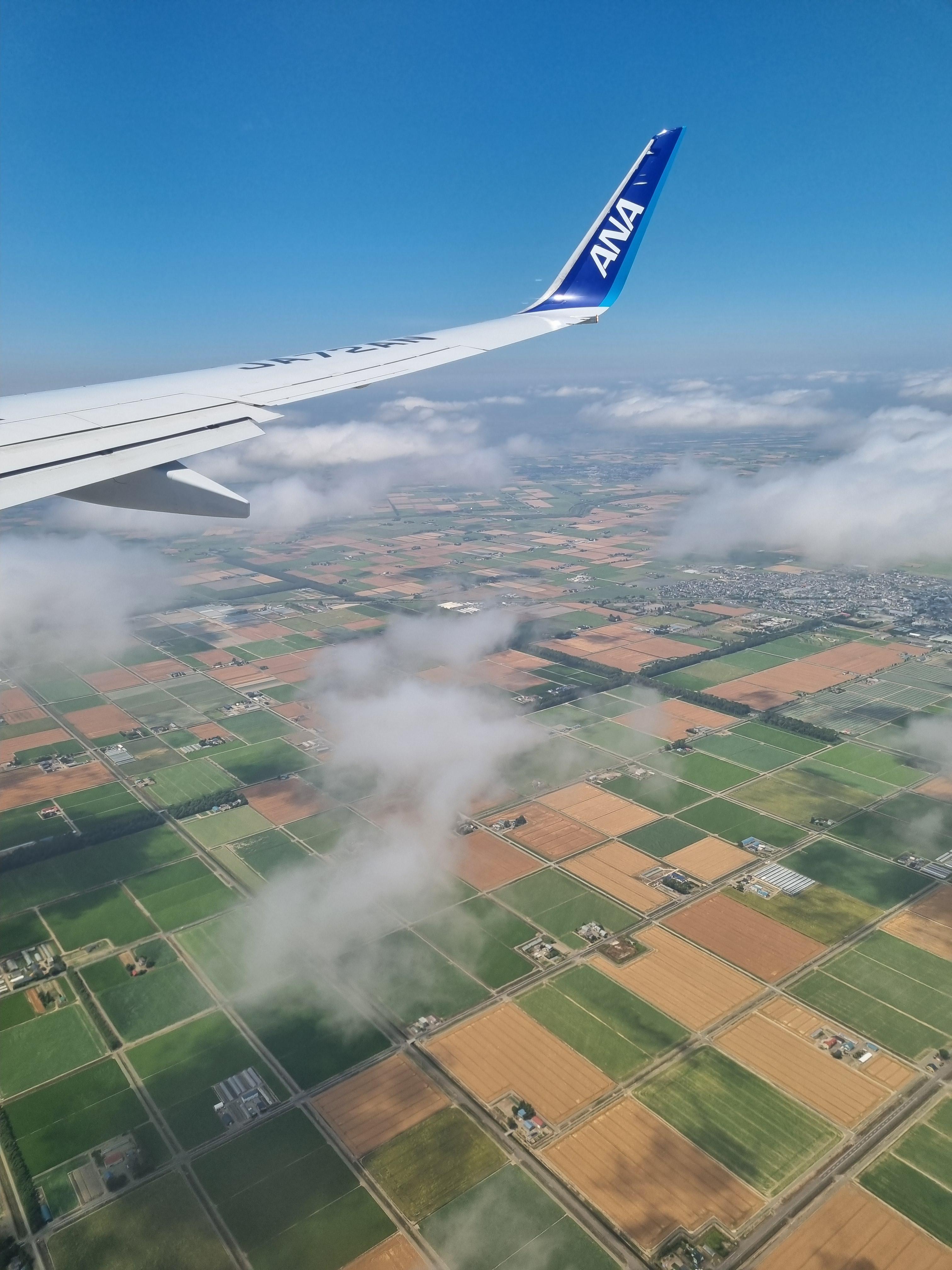 신 치토세 공항에 가까워지니 논과 밭이 보입니다. 격자 모양으로 구획이 잘 이루어져 하늘에서 봤을 때 상당히 깔끔한 모양이었습니다. 마음이 평화로워지는 광경이었습니다.