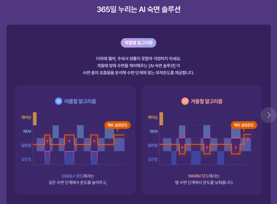 수면단계에따라 온도를 조절해주는 AI 알고리즘이 있는데 아직 이 기능은 써보지 못했다.