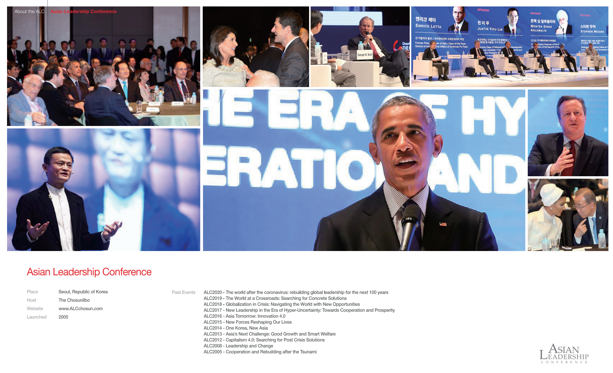 2005년 제1회 대회가 개최된 이래 버락 오바마 전 미국 대통령, 마윈 알리바바 그룹회장, 제프리삭스 컬럼비아대 교수 등 저명한 글로벌 리더와 학자들이 ALC연사로 참여했습니다. 글로벌 기업의 최고위 임원들과 정부 관계자, 학자, 대학생 등 3500명이 매년 참석하는 행사입니다.