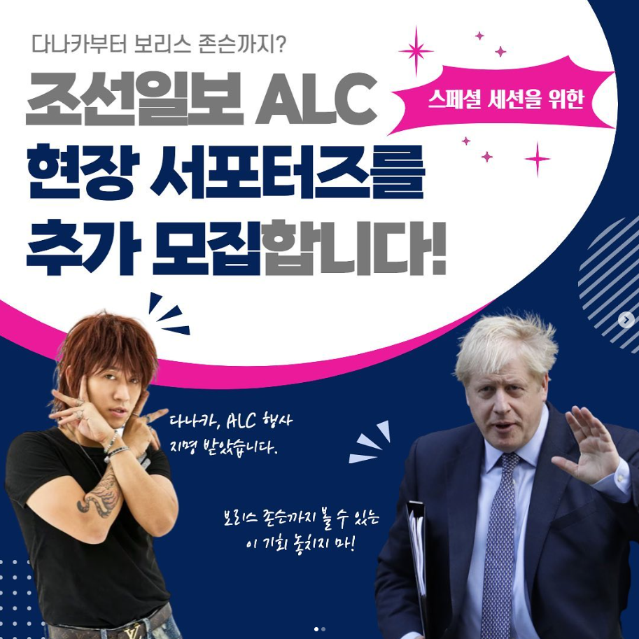 ALC 인스타그램을 통해 공개된 사실인데 5월 17일 수요일 일정에 요즘 높은 주가를 달리는 호스트 다나카와 영국 전 총리였던 보리스 존슨이 온다고 합니다. 스페셜 세션 놓치지 마세요 ^_^