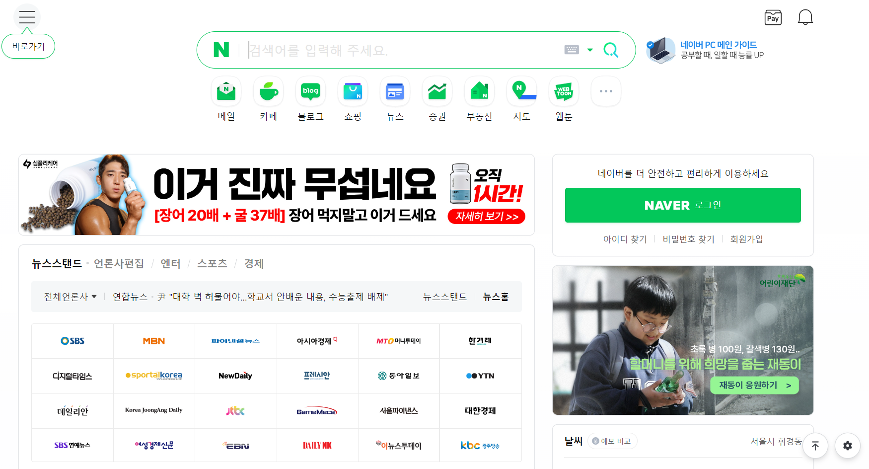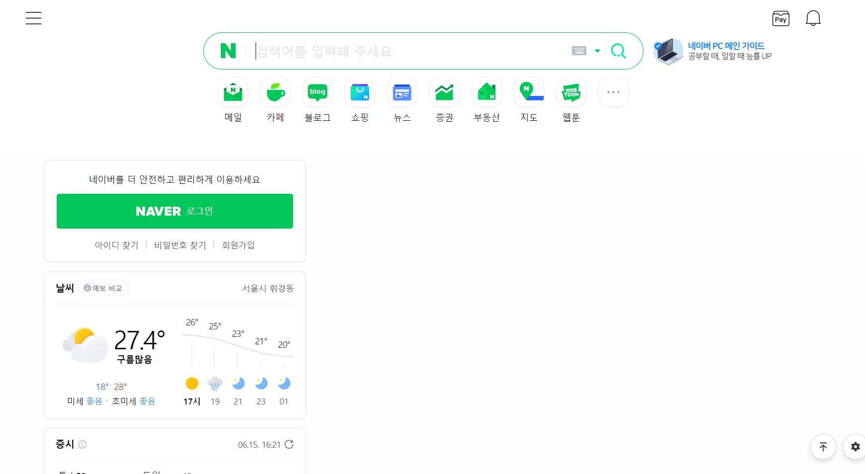 따라서 새로운 포털(2023-06-15 현재)에서 아래와 같이 네이버 홈페이지를 이용할 수 있게 수정하여 올려드립니다.