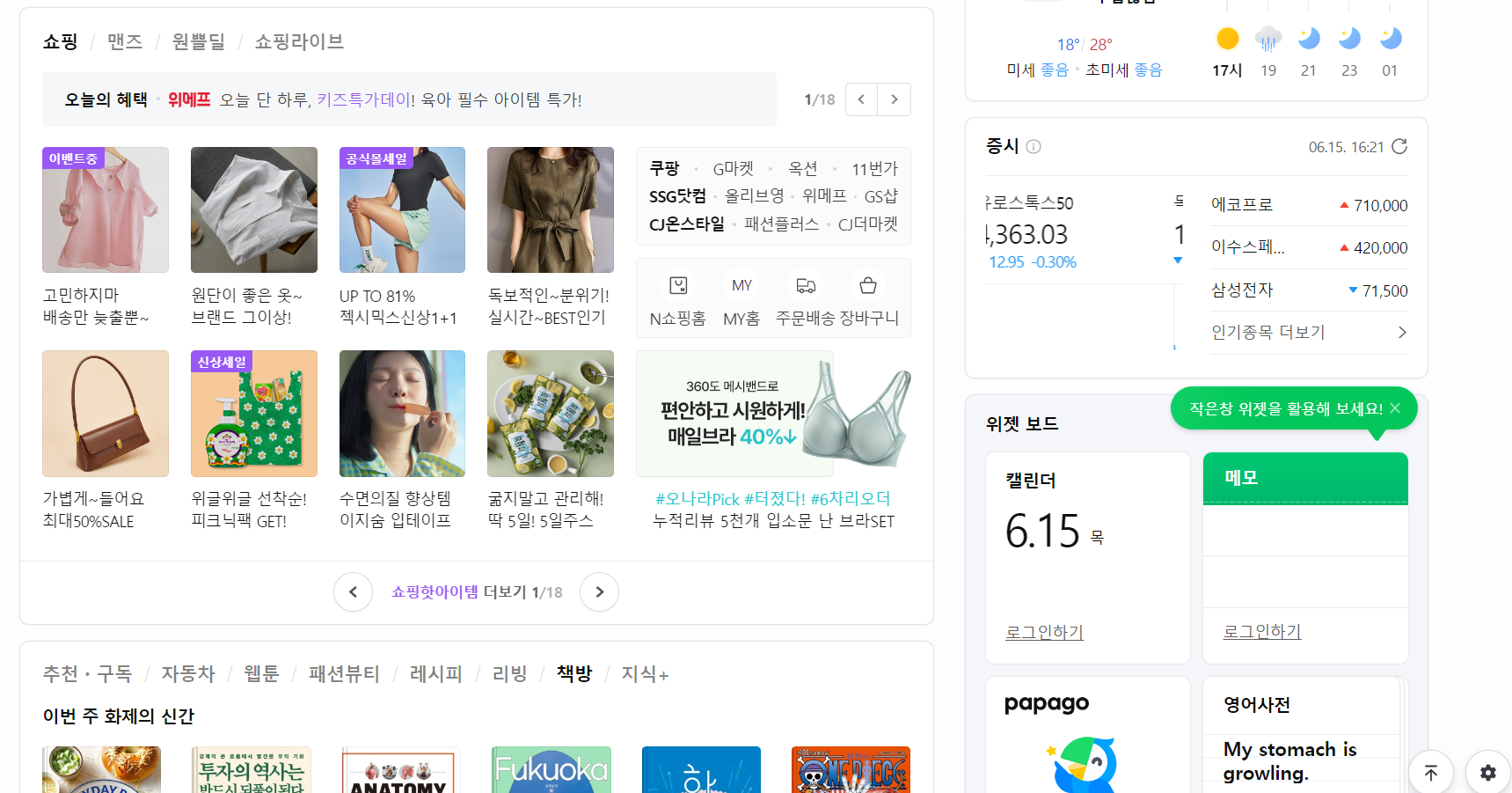 로그인 창과, 날씨창만을 남기고, 뉴스스탠드와 쇼핑 탭을 제거한 상태입니다.