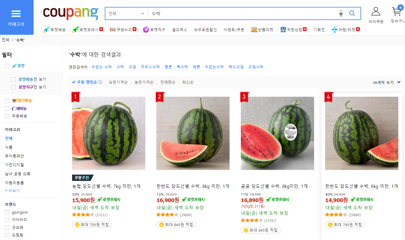 예를들면, 쿠팡 농협 당도선별 수박을 보면, 당도선별임에도 불구하고...