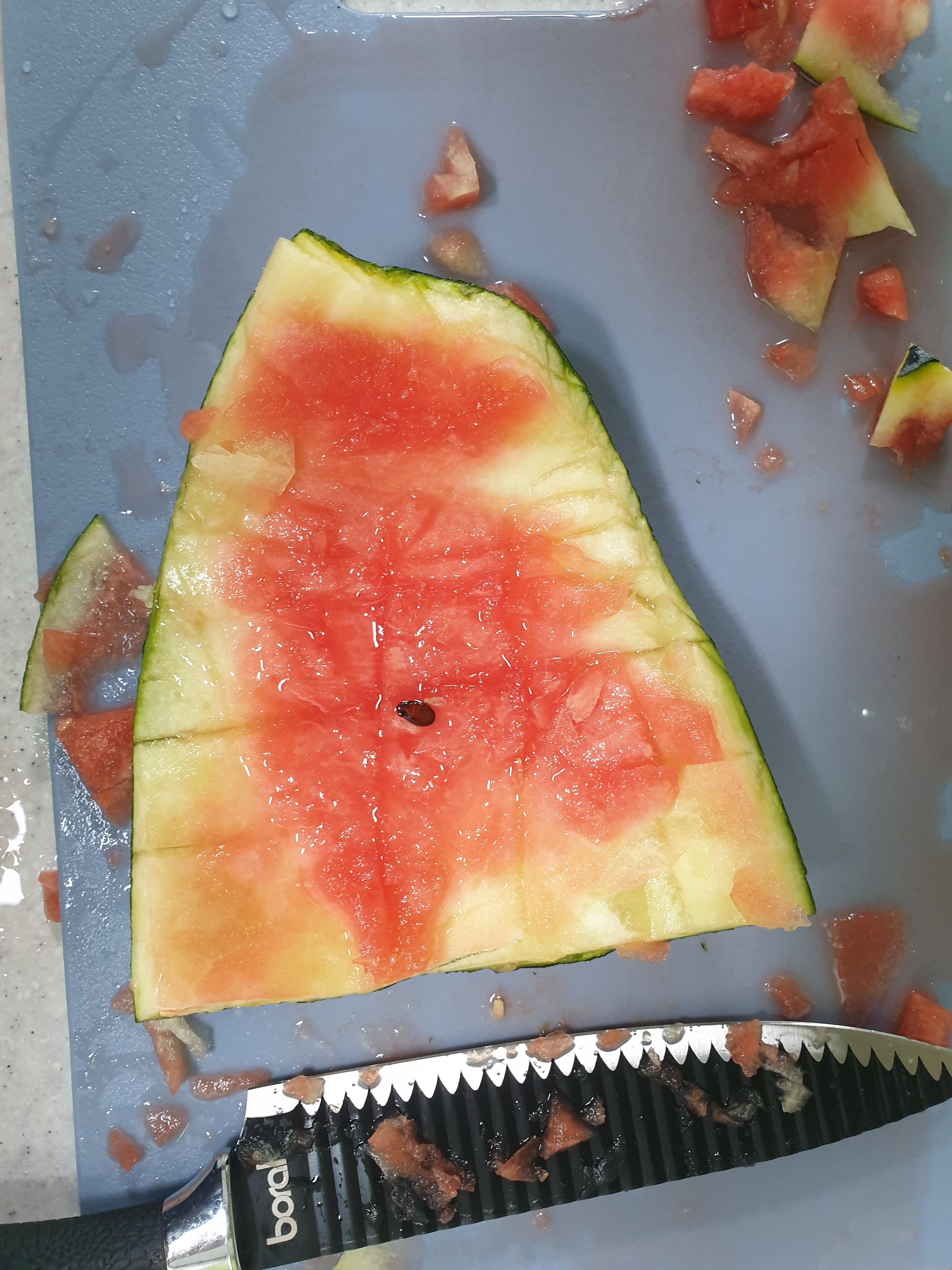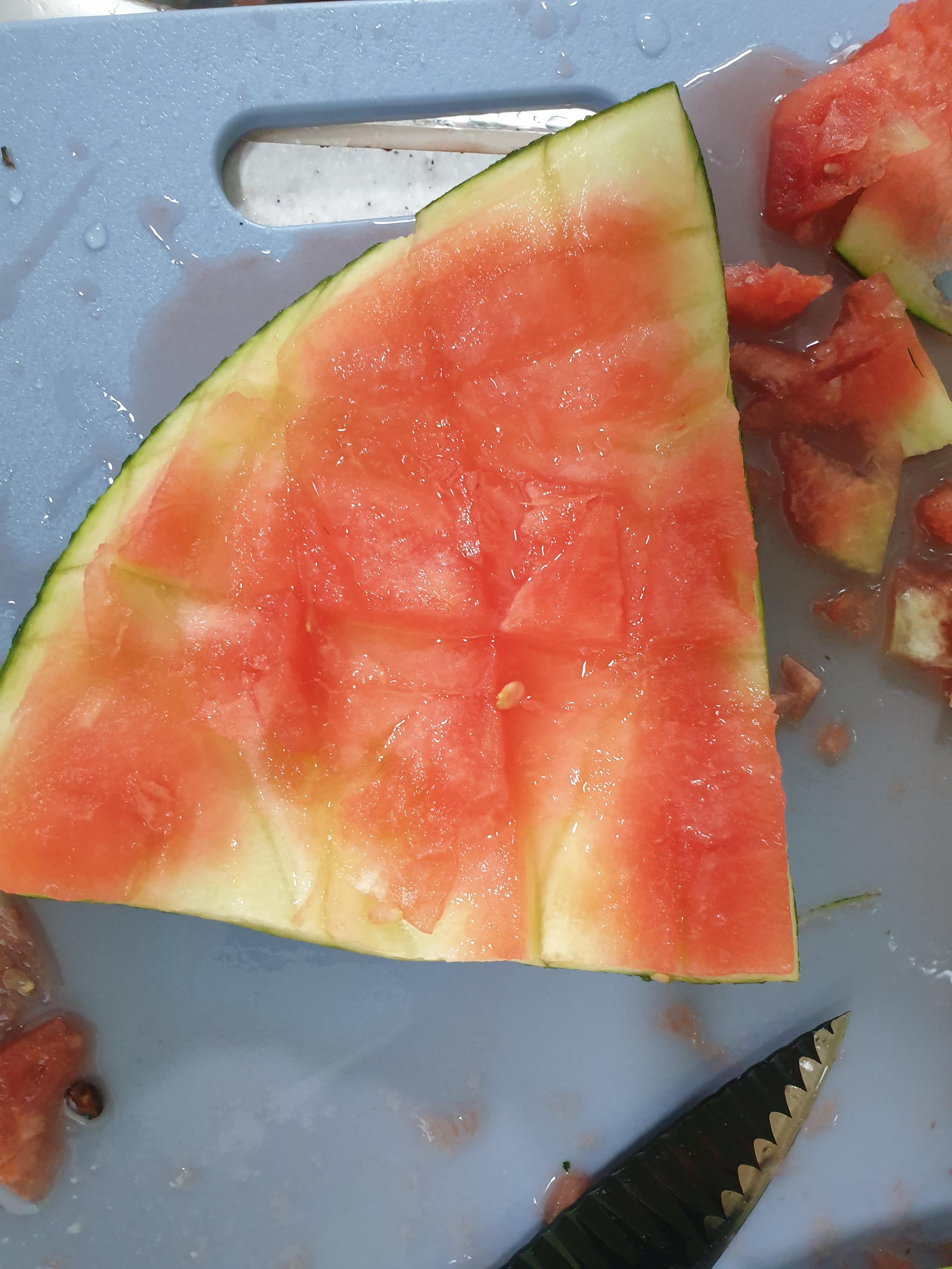 수박은 생각보다 칼이 잘 들기 때문에 (속을 자를때는 엄청 부드럽다가, 껍질을 자를때는 턱 걸려버려요.)